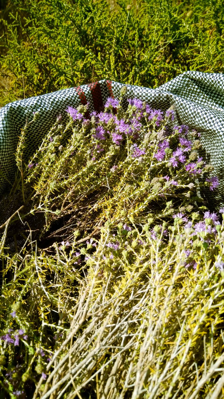 Die Erntezeit für Thymian auf Kreta erstreckt sich in der Regel von Mitte Frühling bis zum frühen Sommer, wenn die Pflanzen ihre volle Blüte erreichen. Zu diesem Zeitpunkt sind die ätherischen Öle in den Blättern und Blüten des Thymians am konzentriertesten, was zu einem intensiven Aroma und Geschmack führt. Unsere Farmer/innen ernten den Thymian von Hand, um die zarten Pflanzen nicht zu beschädigen. Sie schneiden die Triebe nahe der Basis ab und sammeln sie in Körben.